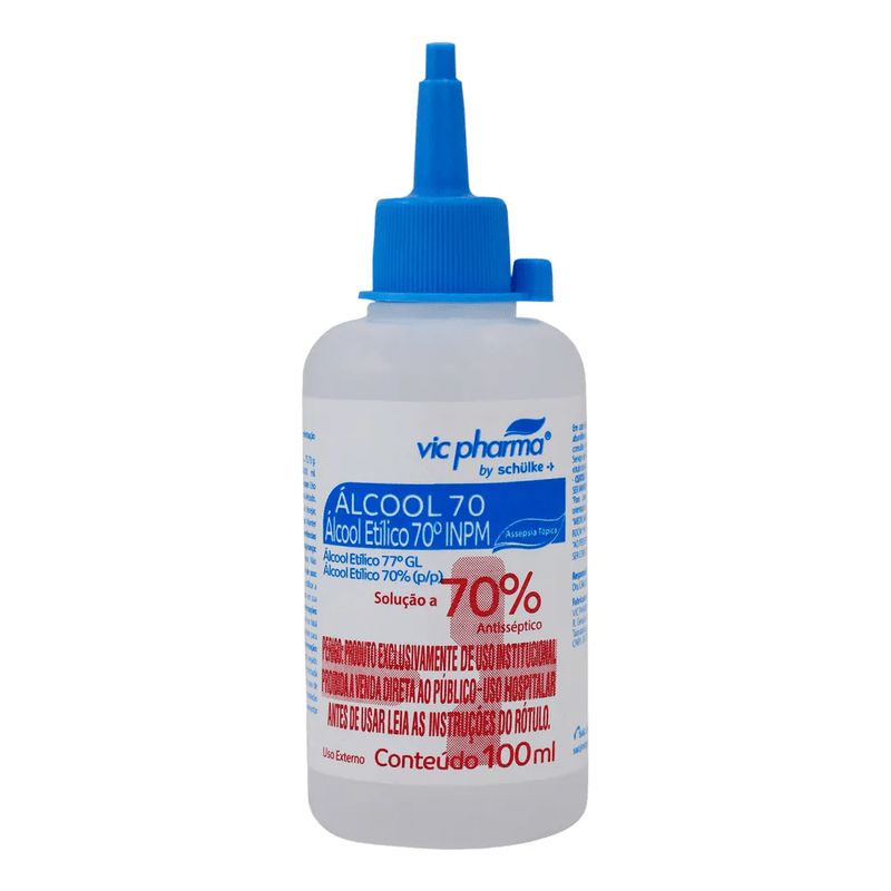 Álcool 70% Vic Pharma 100ml Almotolia Utilizado para fazer a assepsia da pele em machucados ou antes de procedimentos pouco invasivos, podendo utilizar um algodão ou gaze como auxilio.